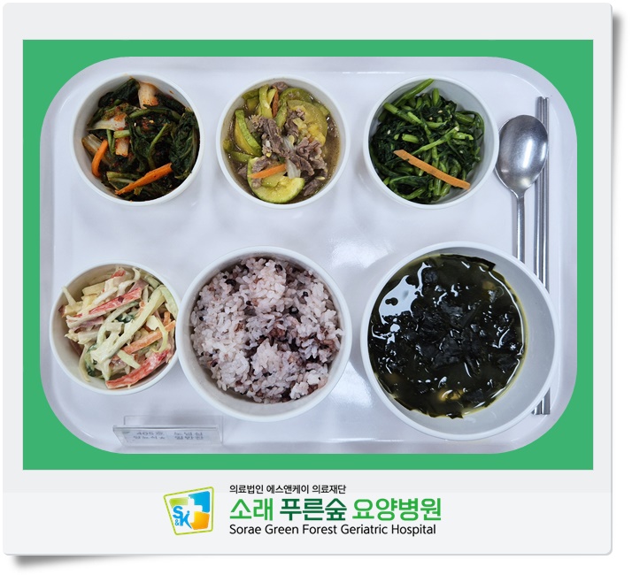 ▷ 7월 17일 중식 : 백미밥(죽/잡곡밥) / 홍합살미역국 / 우채호박볶음 / 쑥갓나물무침 / 멕시칸샐러드 / 열무김치 ◁
