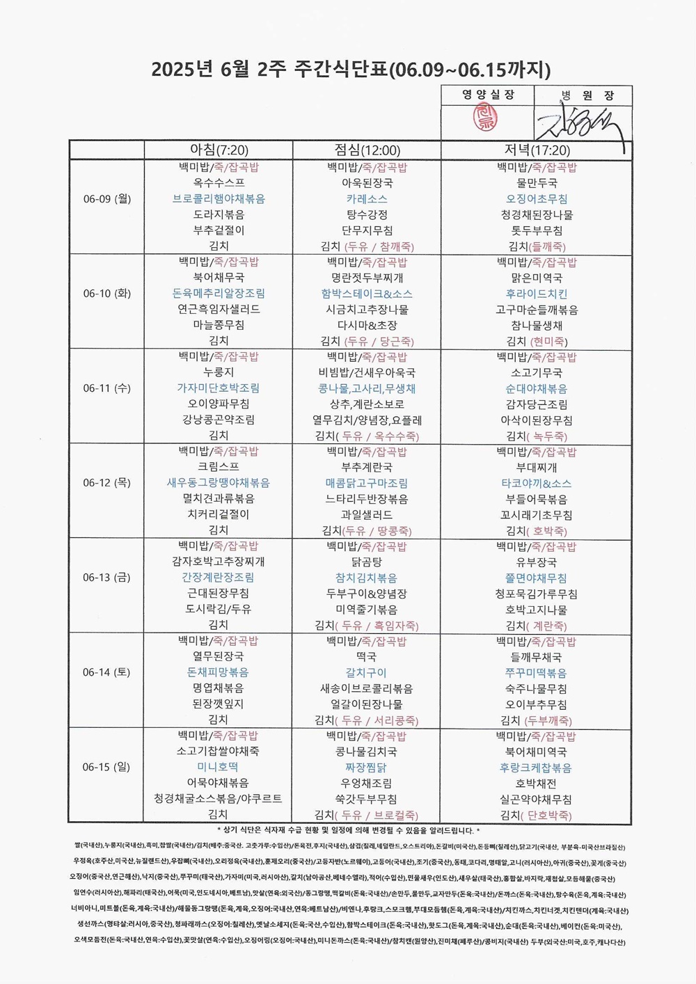 2025년 6월 2째주 주간식단표