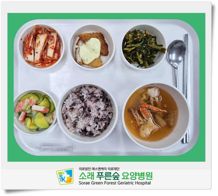 ▷ 6월 16일 중식 : 백미밥(죽/잡곡밥) / 꽃게탕 / 생선까스&타르소스 / 호박맛살볶음 / 미나리초무침 / 김치 ◁
