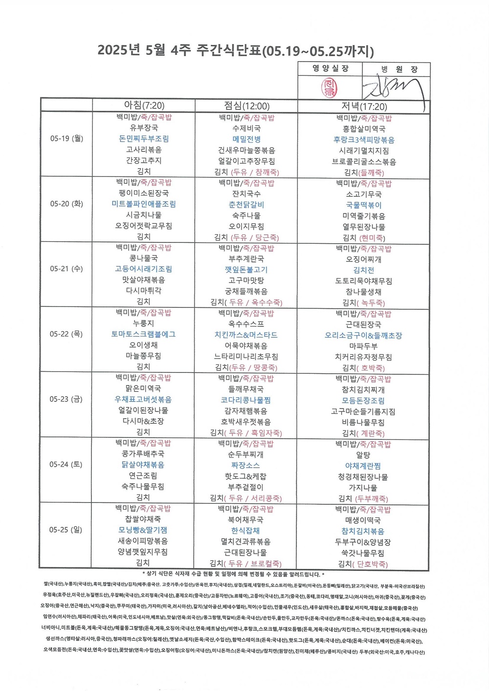 2025년 5월 4째주 주간식단표