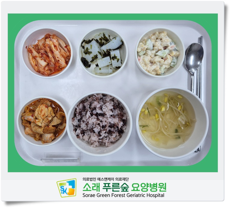 ▷ 5월 27일 중식 : 백미밥(죽/잡곡밥) / 콩나물국 / 묵은지닭볶음탕 / 청포묵김가루무침 / 마카로니콘샐러드 / 김치 ◁