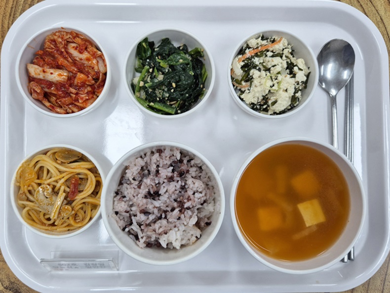 ▷ 4월 23일 중식 : 백미밥(죽/잡곡밥) / 오징어찌개 / 스파게티 / 톳두부무침 / 시금치된장무침 / 김치 ◁