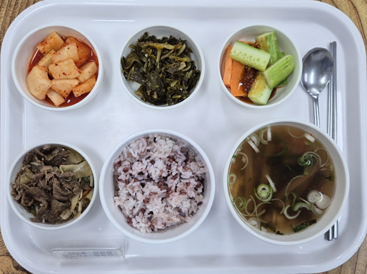 ▷ 4월 24일 중식 : 백미밥(죽/잡곡밥) / 도토리묵채국 / 소불고기 / 시래기된장지짐 / 오이당근스틱&쌈장 / 깍두기 ◁