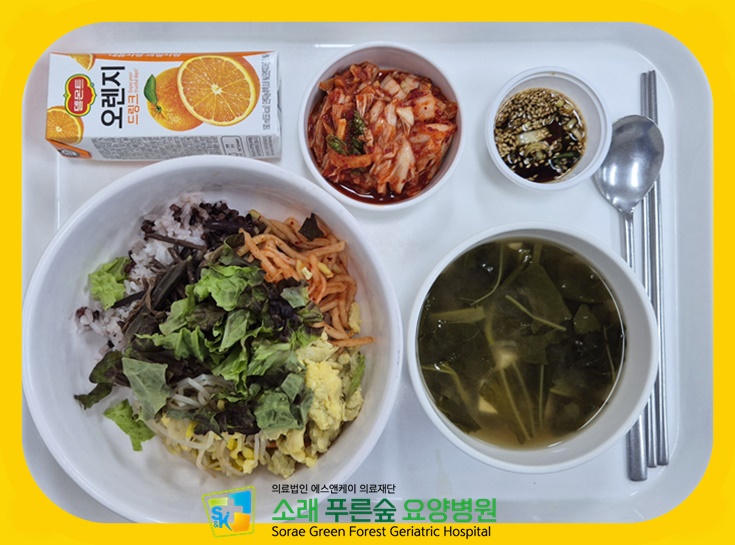▷ 4월 28일 중식 : 비빔밥(콩나물,고사리,무생채,상추,계란소보로) / 아욱된장국 / 오렌지주스 / 양념장 / 김치 ◁