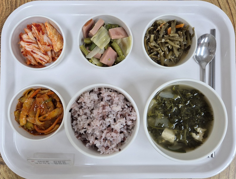 ▷ 4월 2일 중식 : 백미밥(죽/잡곡밥) / 쑥국 / 오징어야채볶음 / 햄그린빈야채볶음 / 고구마순된장지짐 / 김치 ◁