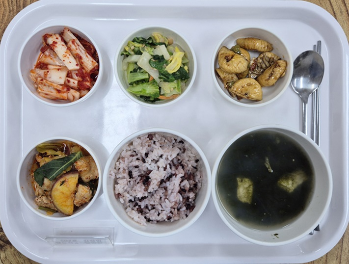 ▷ 4월 7일 중식 : 백미밥(죽/잡곡밥) /매생이굴국 / 춘천닭갈비 / 무화과견과류조림 / 얼갈이된장무침 / 김치 ◁
