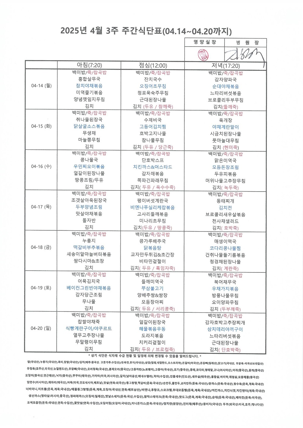 2025년 4월 3째주 주간식단표