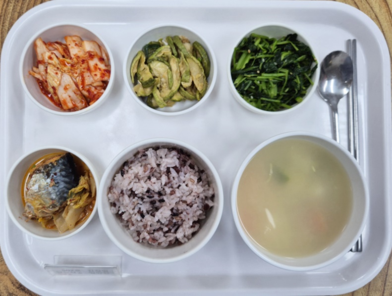 ▷ 4월 15일 중식 : 백미밥(죽/잡곡밥) / 수제비국 / 고등어김치찜 / 호박고지나물 / 참나물무침 / 김치 ◁