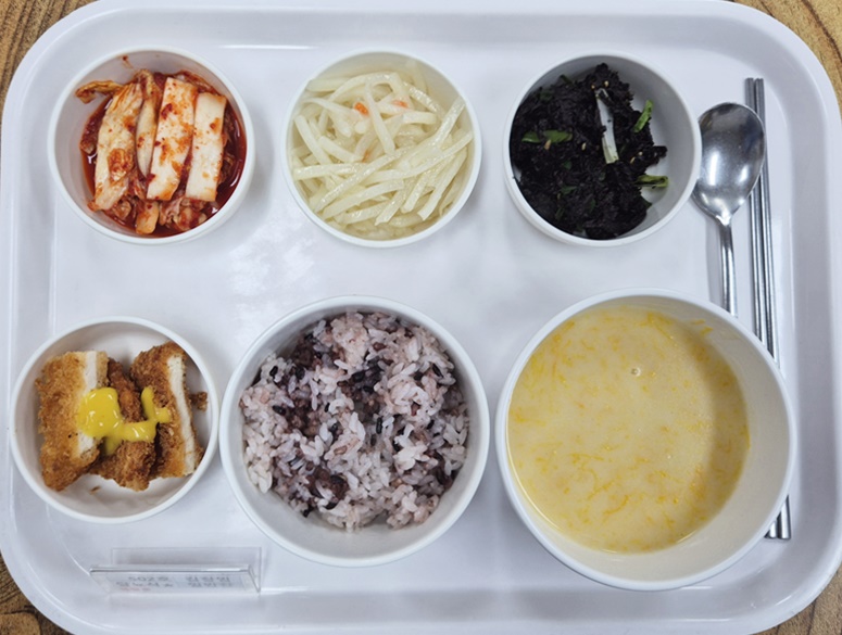 ▷ 4월 15일 중식 : 백미밥(죽/잡곡밥) / 단호박스프 / 치킨까스&머스타드 / 감자채볶음 / 쪽파건파래무침 / 김치 ◁
