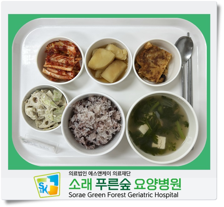 ▷ 04월 02일 중식 : 백미밥(죽/잡곡밥) / 명란젓두부찌개/ 해물김치전/ 감자당근조림/ 연근흑임자샐러드 / 김치 ◁