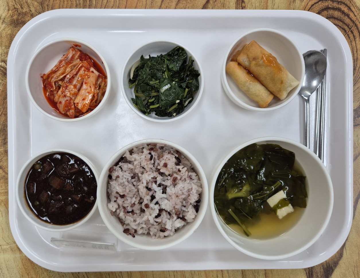▷3월 24일 중식 : 백미밥(죽/잡곡밥) / 아욱된장국 / 짜장소스 / 야채춘권&칠리소스 / 바라깻잎나물 / 김치◁