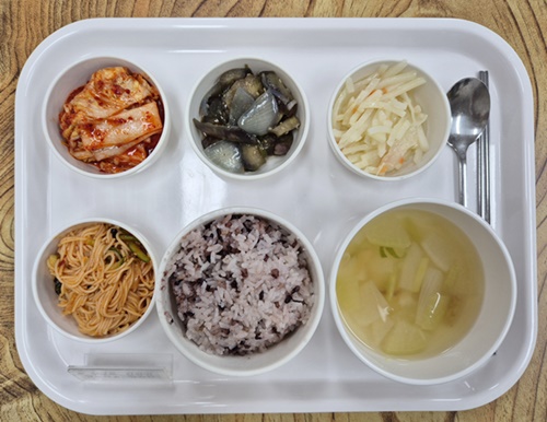 ▷3월 25일 중식 : 백미밥(죽/잡곡밥) / 북어채무국 / 비빔국수 / 감자채볶음 / 가지굴소스볶음 / 김치◁