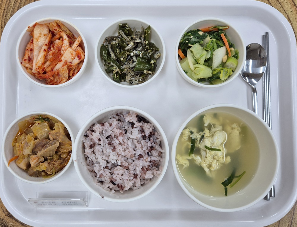▷3월 28일 중식 : 백미밥(죽/잡곡밥) / 부추계란국 / 묵은지닭볶음탕 / 풋고추멸치볶음 / 얼갈이된장나물 / 김치◁