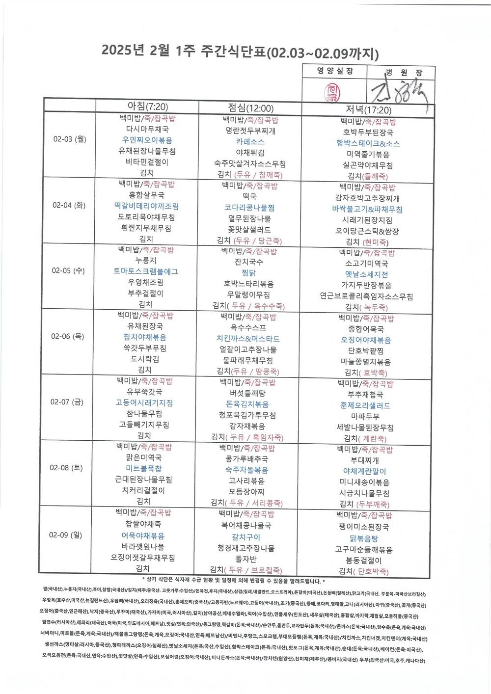 2025년 2월 1째주 주간식단표