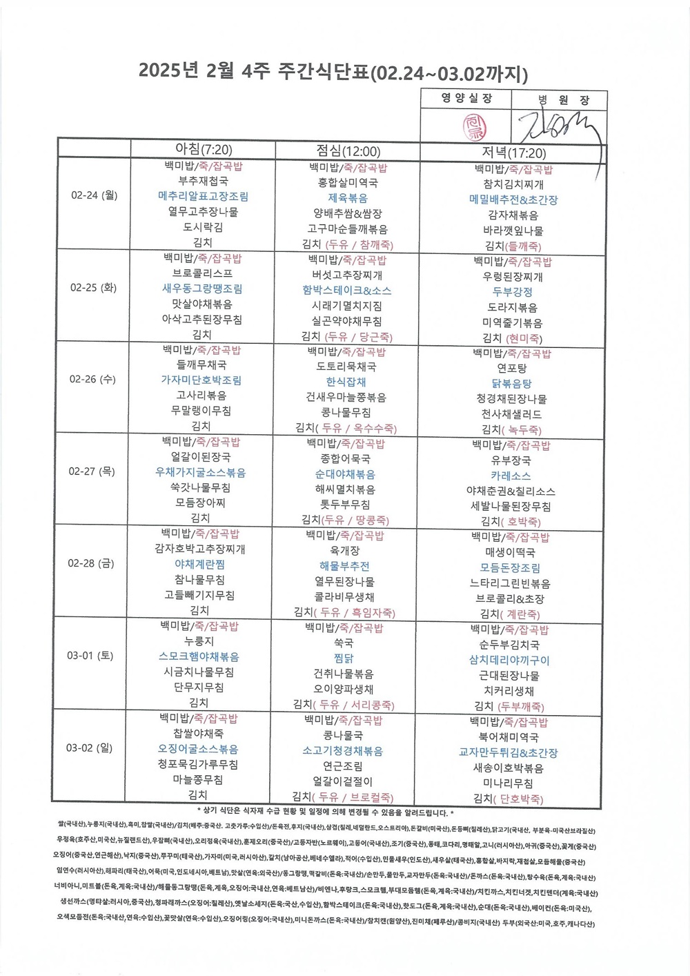 2025년 2월 4째주 주간식단표