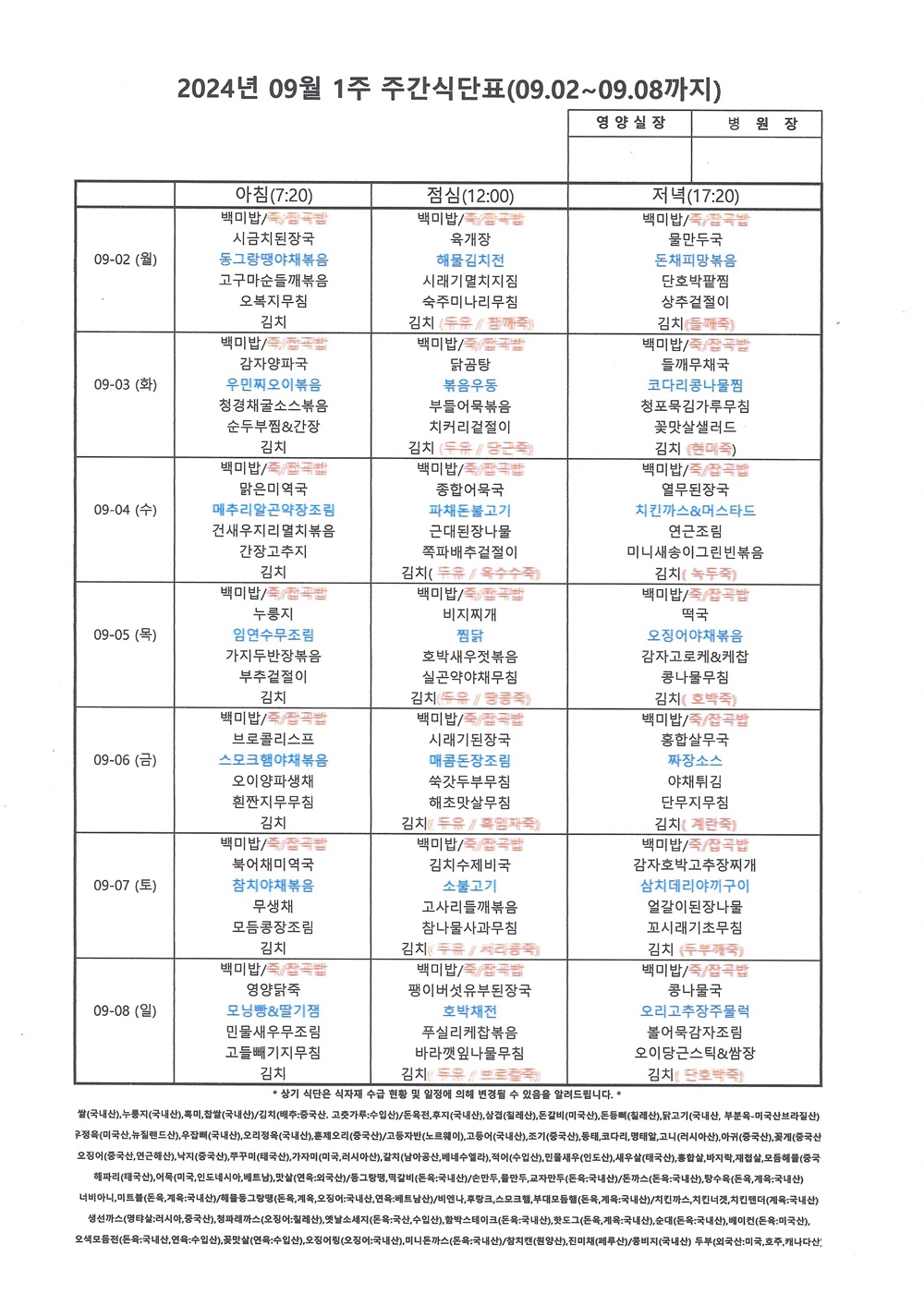 2024년 9월 1째주 주간식단표