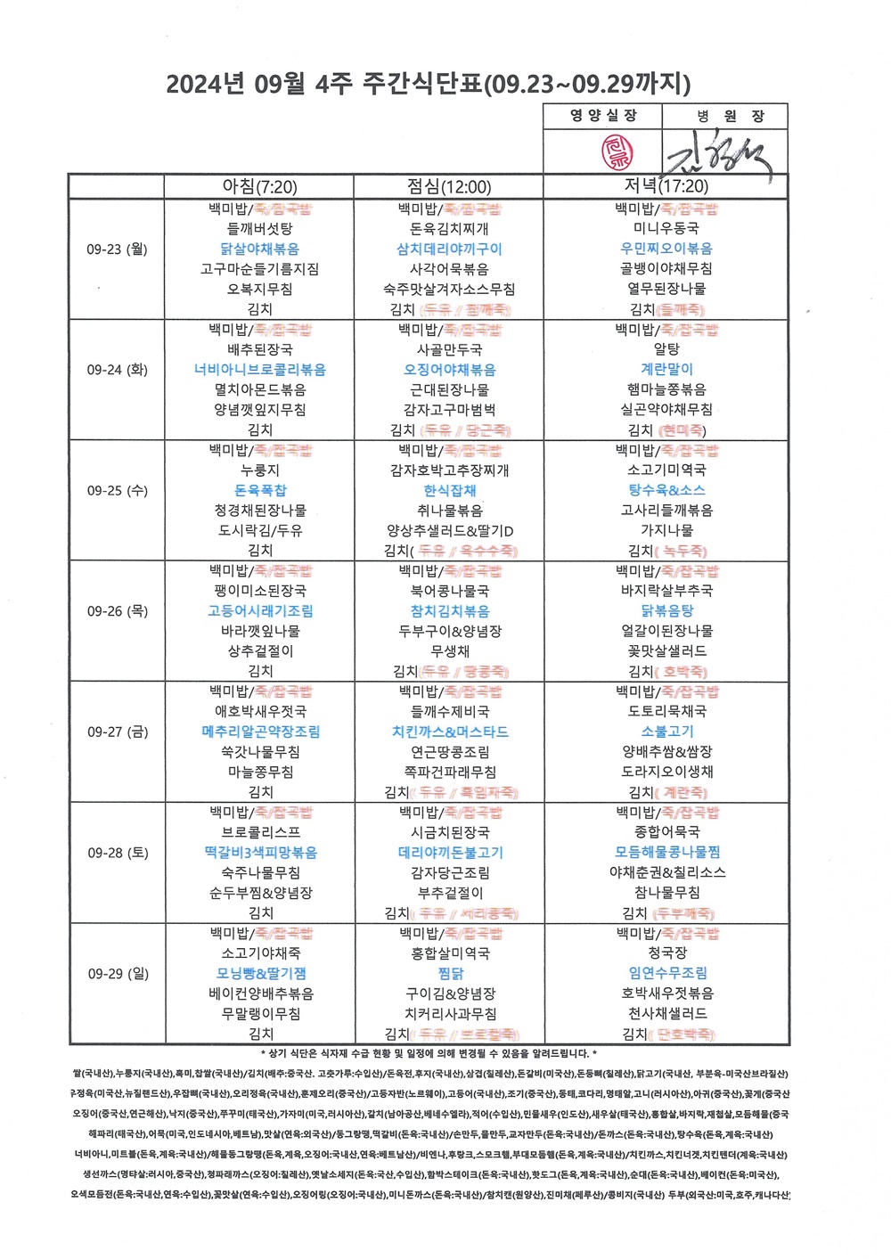 2024년 9월 4째주 주간식단표