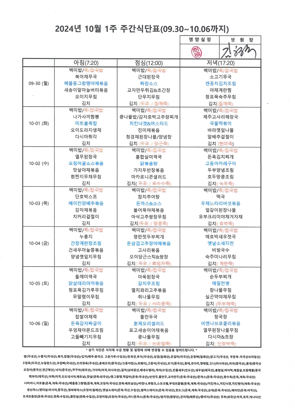 2024년 10월 1째주 주간식단표
