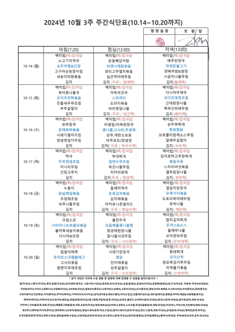 2024년 10월 3째주 주간식단표