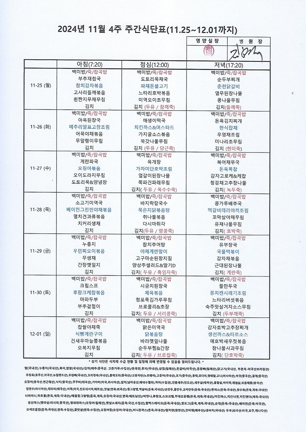 2024년 11월 4째주 주간식단표