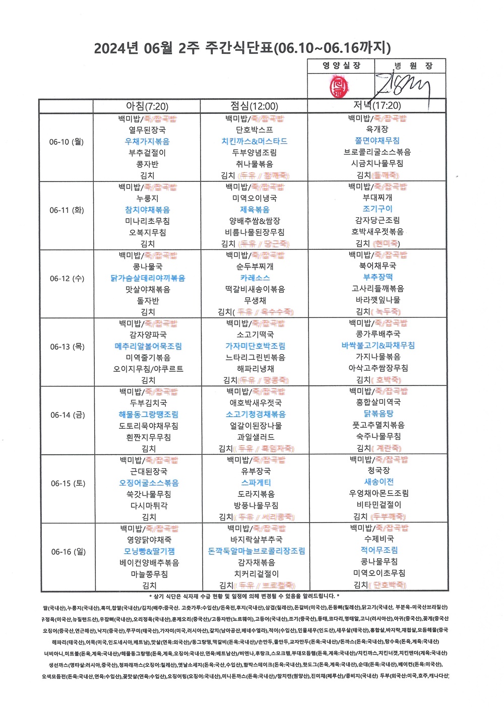 2024년 6월 2째주 주간식단표