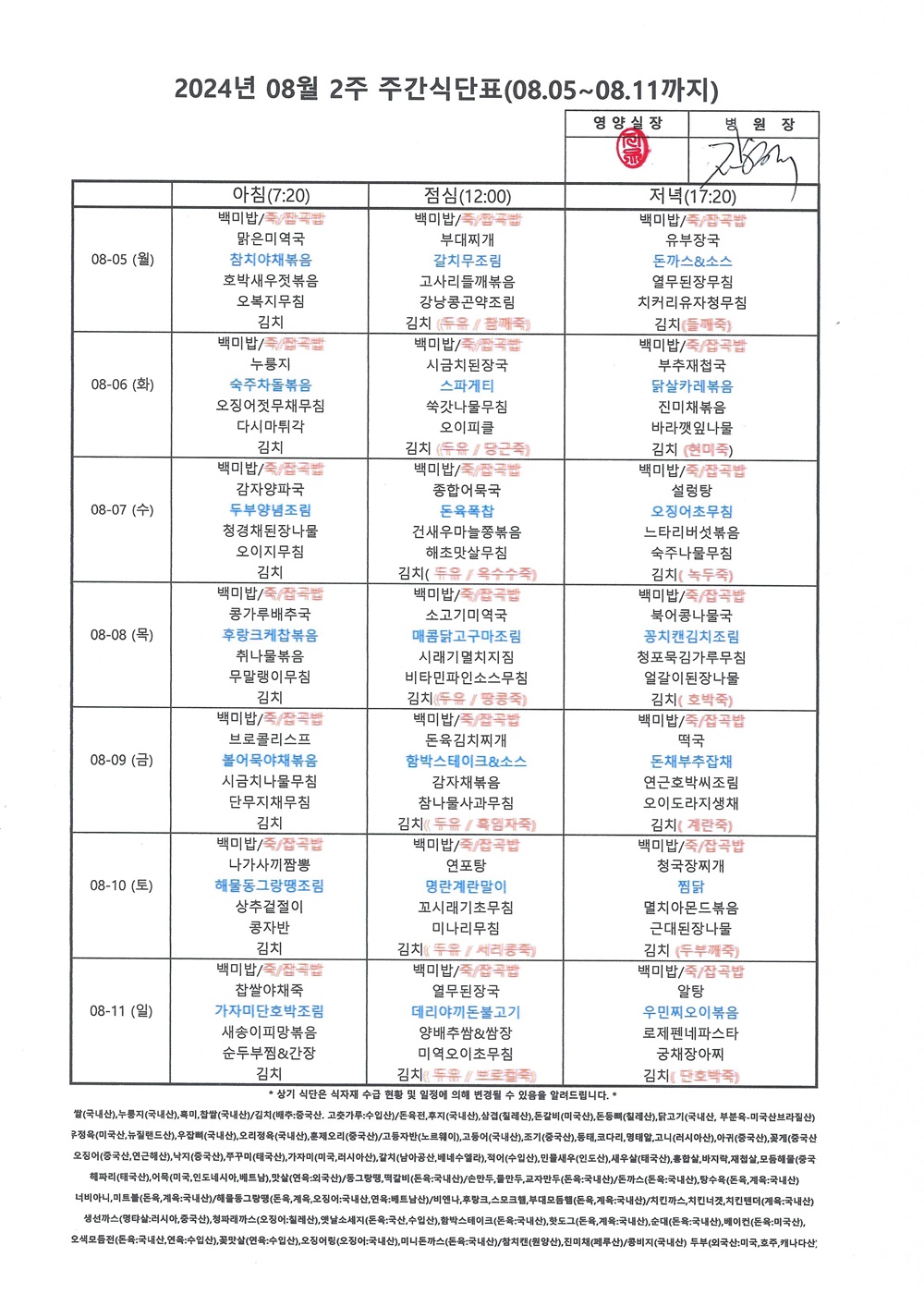 2024년 8월 2째주 주간식단표