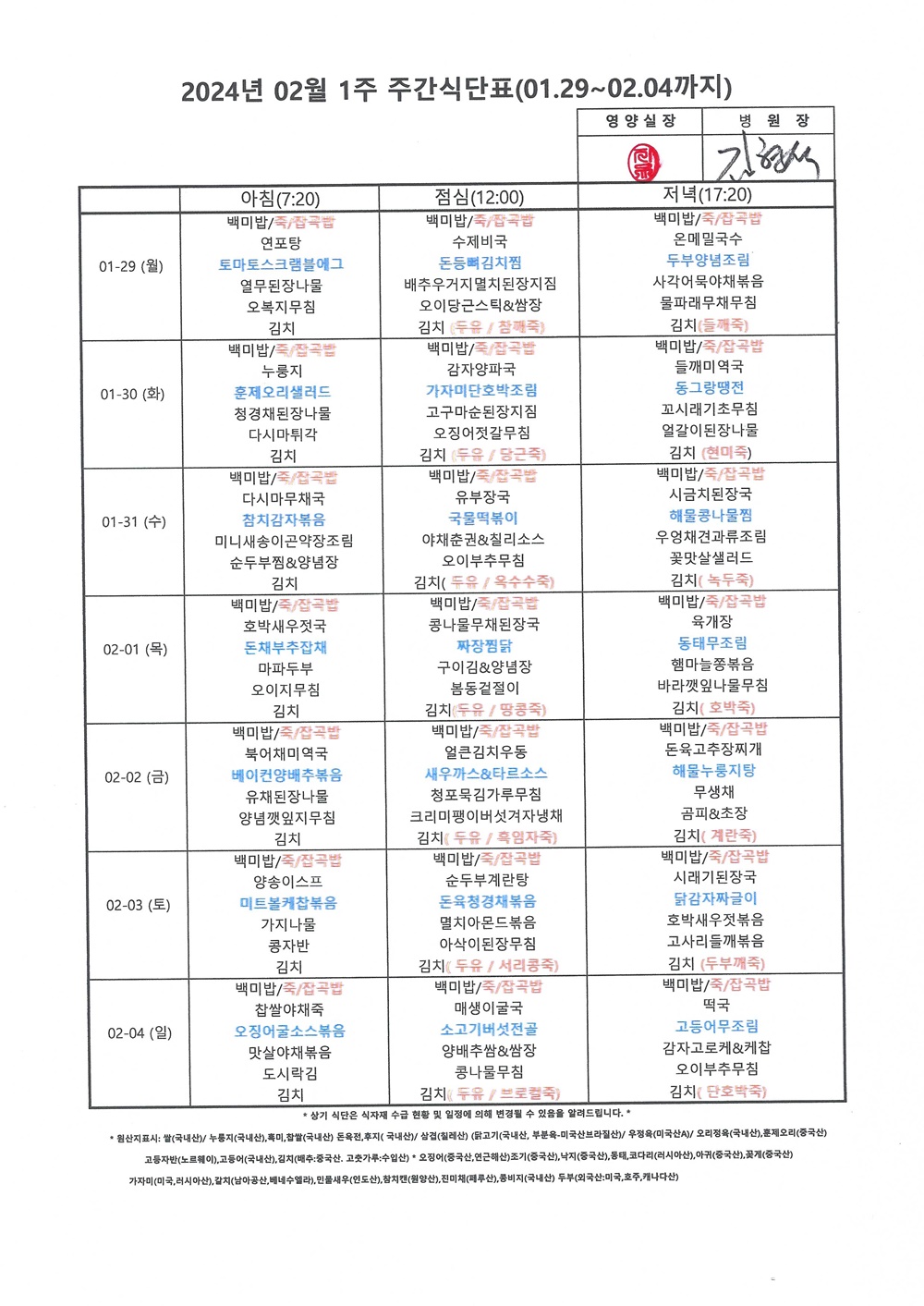2024년 2월 1째주 주간식단표