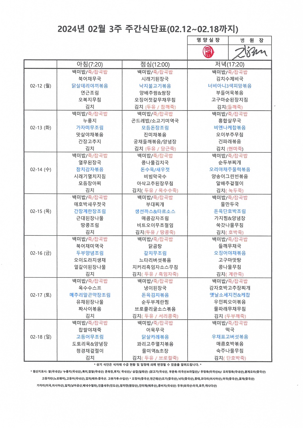 2024년 2월 3째주 주간식단표
