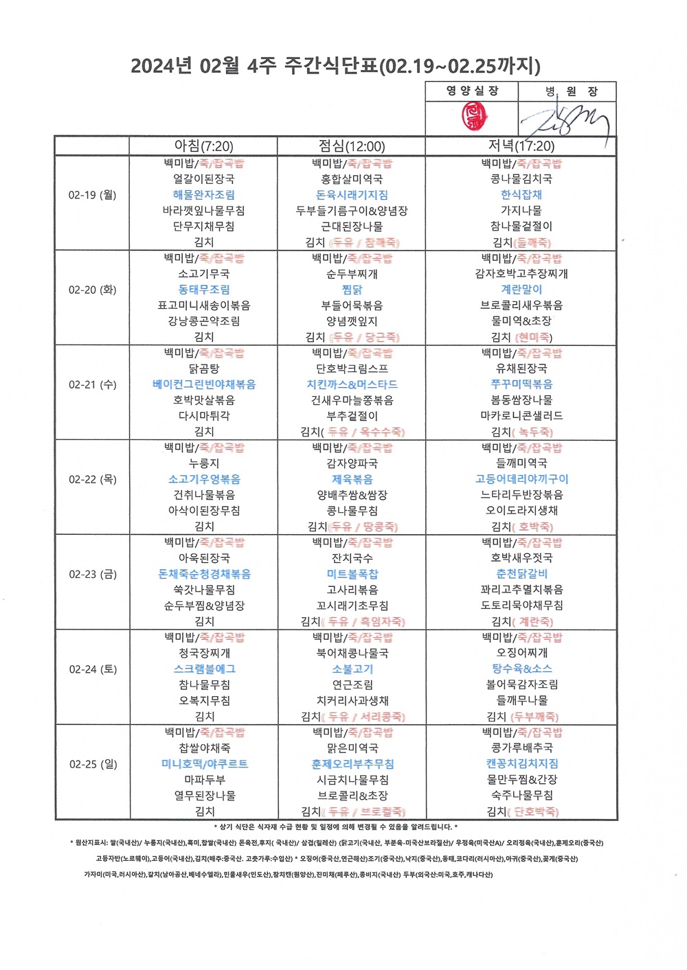 HOME > 병원소식 > 영양식단표