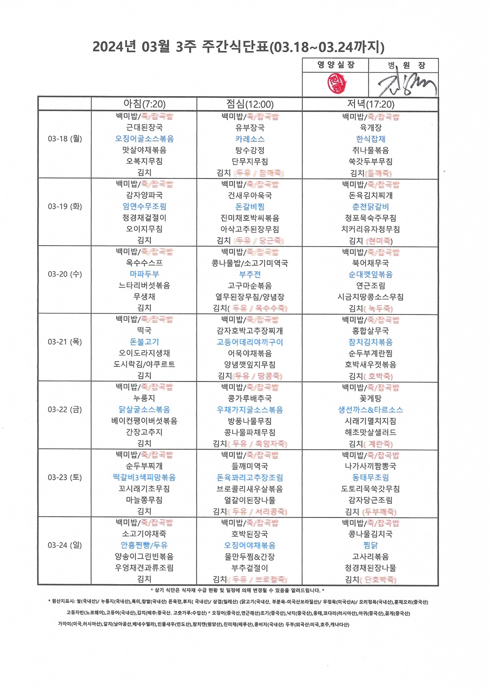 2024년 3월 3째주 주간식단표