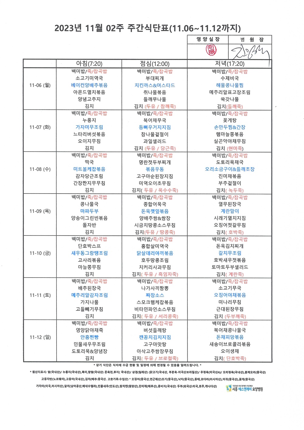 2023년 11월 2째주 주간식단표