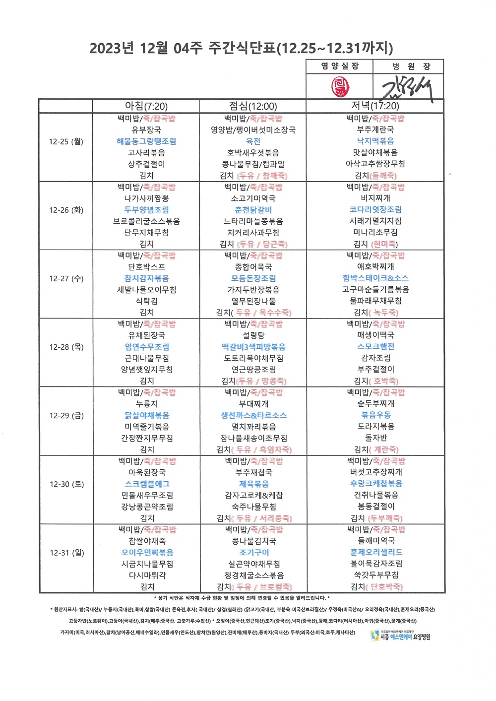 2023년 12월 4째주 주간식단표