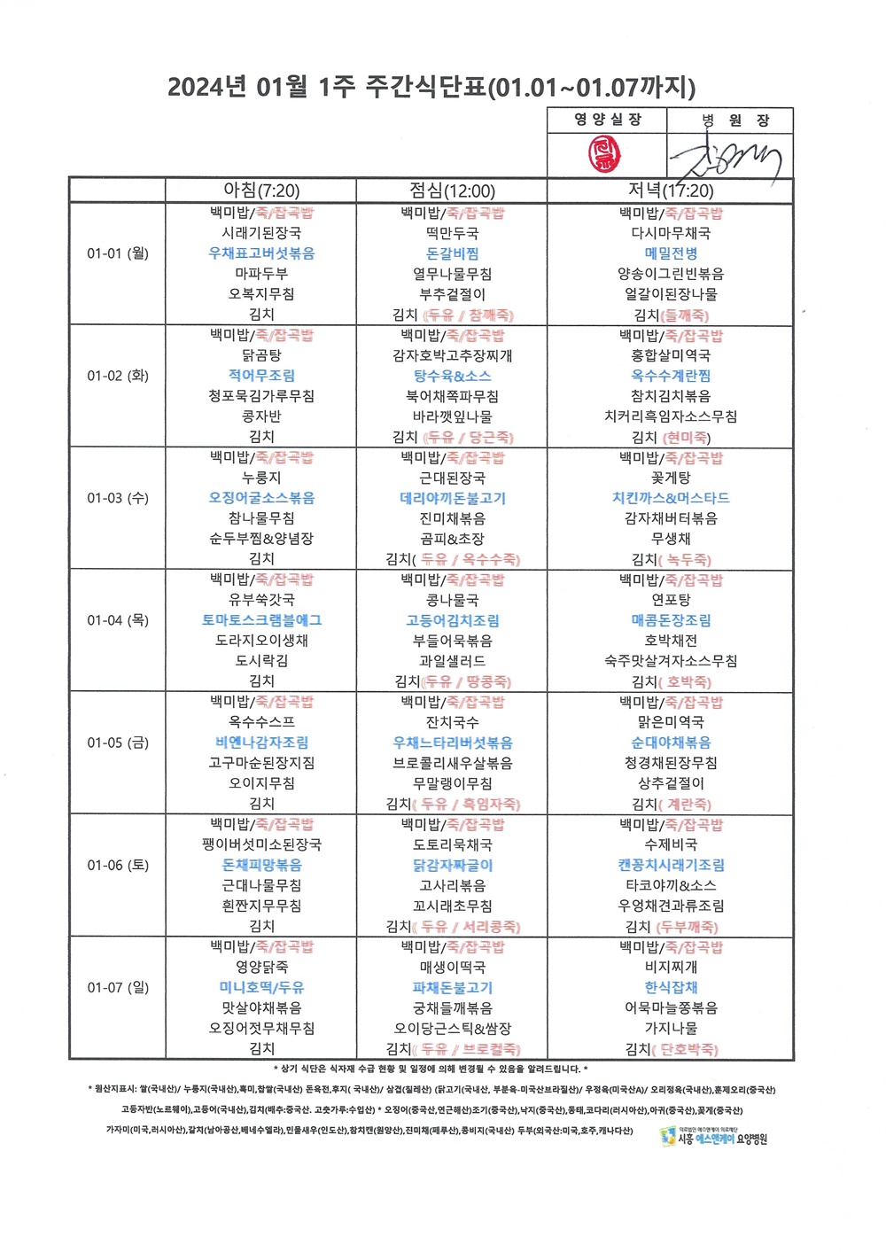 2024년 1월 1째주 주간식단표