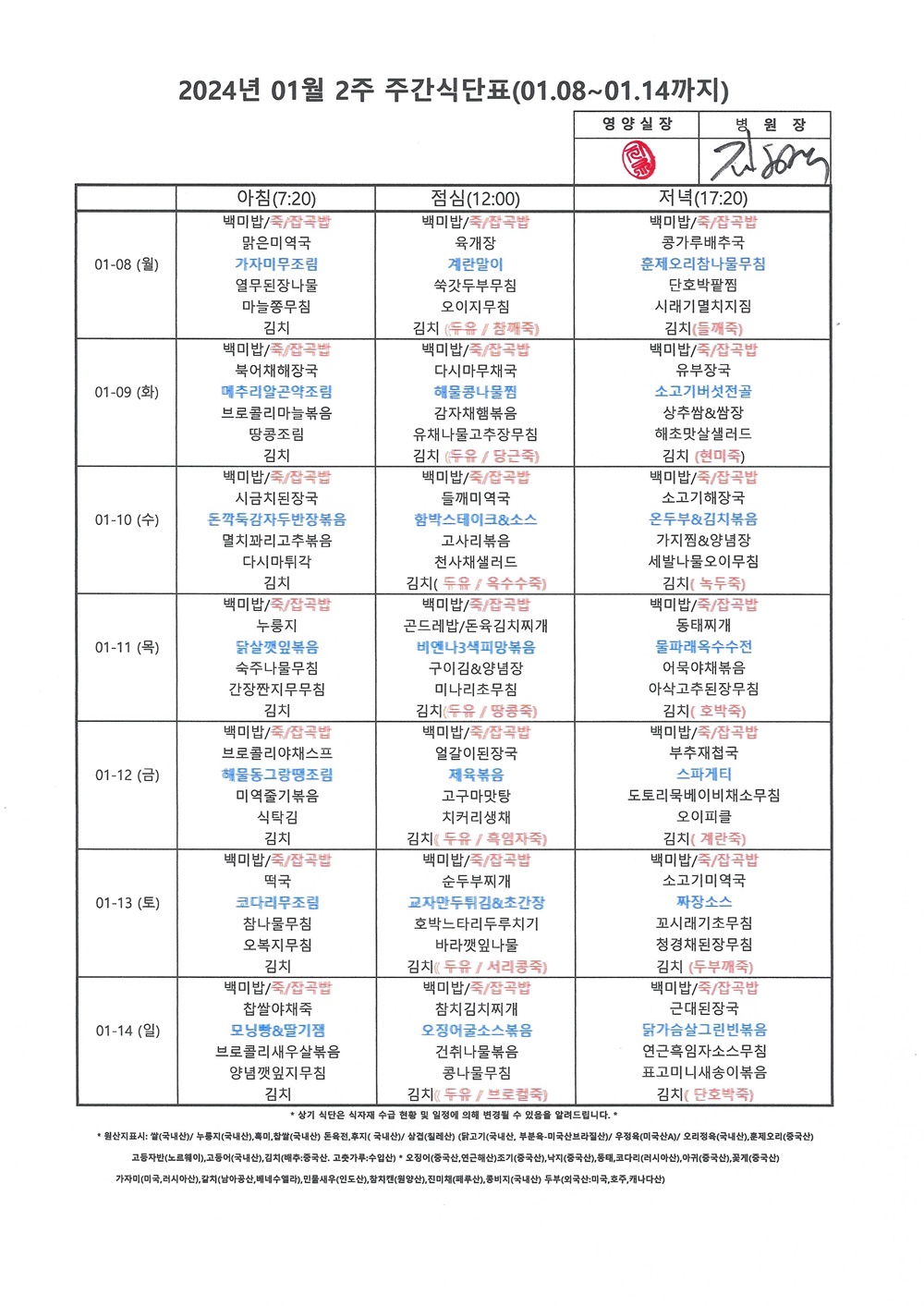 2024년 1월 2째주 주간식단표