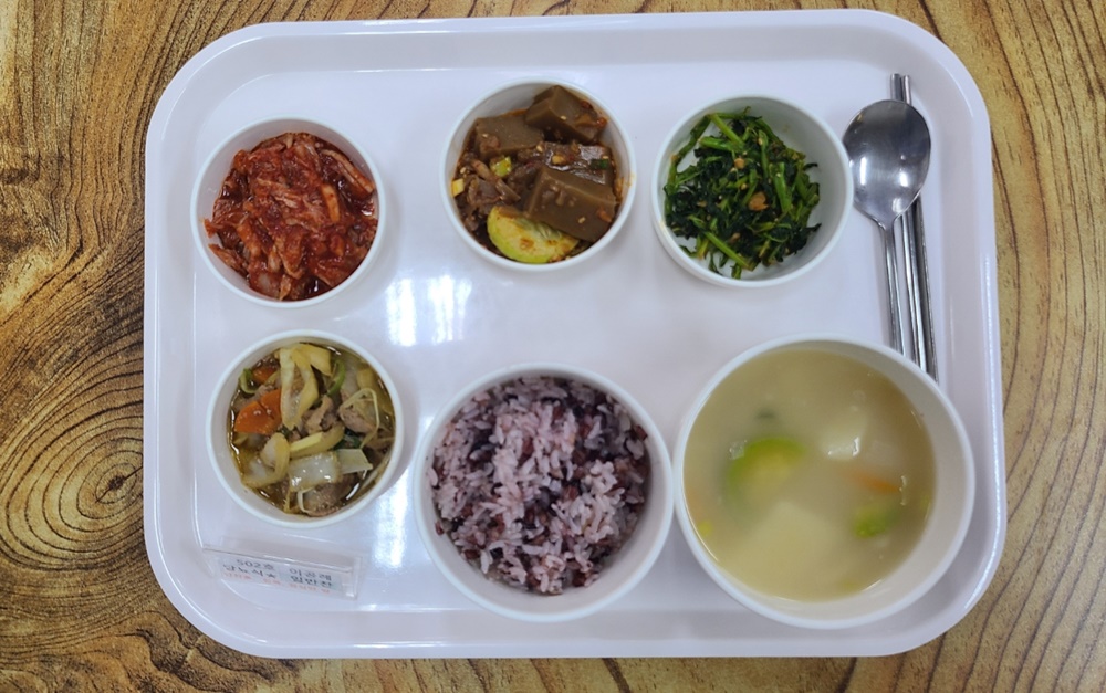 08월 09일 중식은 <백미밥(죽/잡곡밥) / 수제비국 / 파채돈불고기 / 도토리묵야채무침 / 비름나물고추장무침 / 김치 > 였습니다.