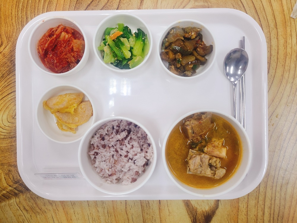 08월 14일 중식은 <백미밥(죽/잡곡밥) / 돈등뼈감자탕 / 옛날소세지전 / 가지두반장볶음 / 청경채된장무침 / 김치 > 였습니다.