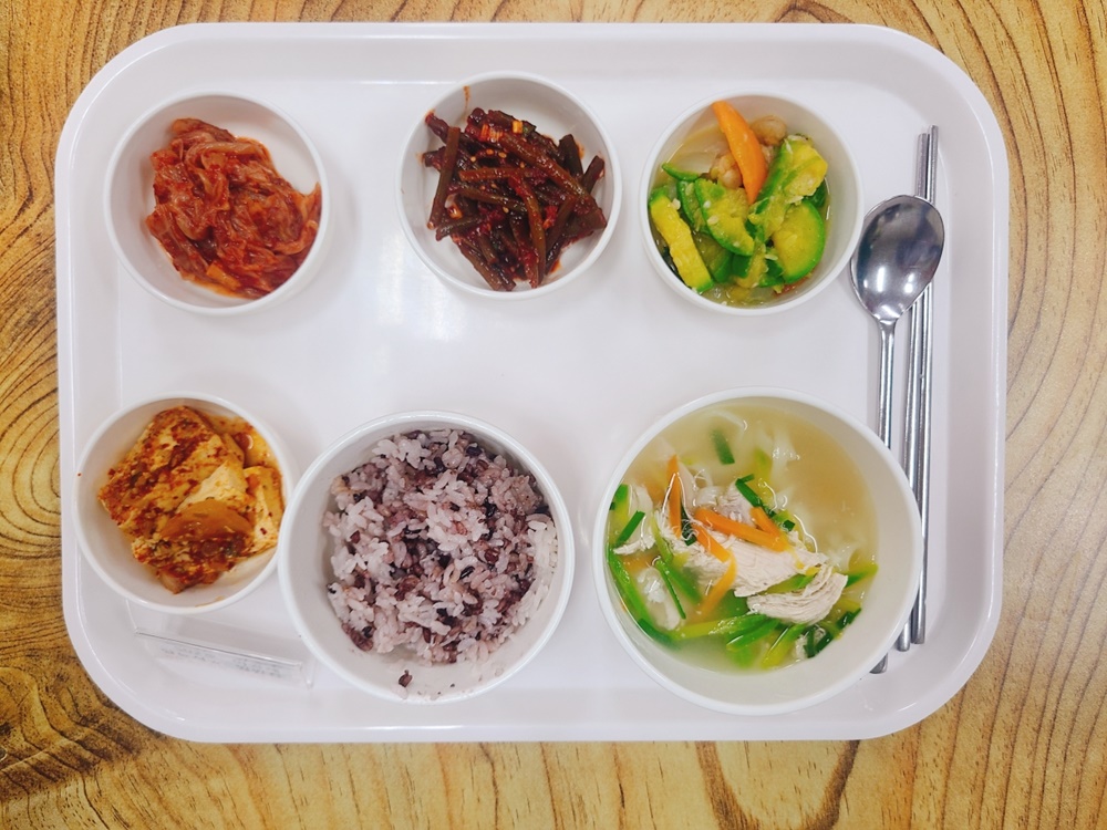 08월 18일 중식은 < 백미밥(죽/잡곡밥) / 닭칼국수 / 두부양념조림 / 호박새우살볶음 / 양념마늘쫑무침 / 김치 > 였습니다.