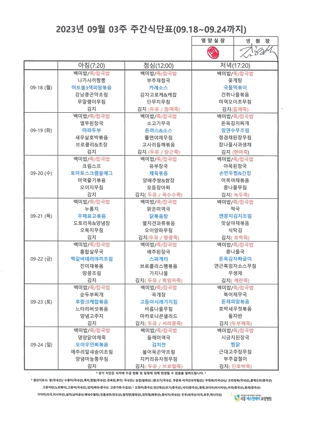 HOME > 병원소식 > 영양식단표