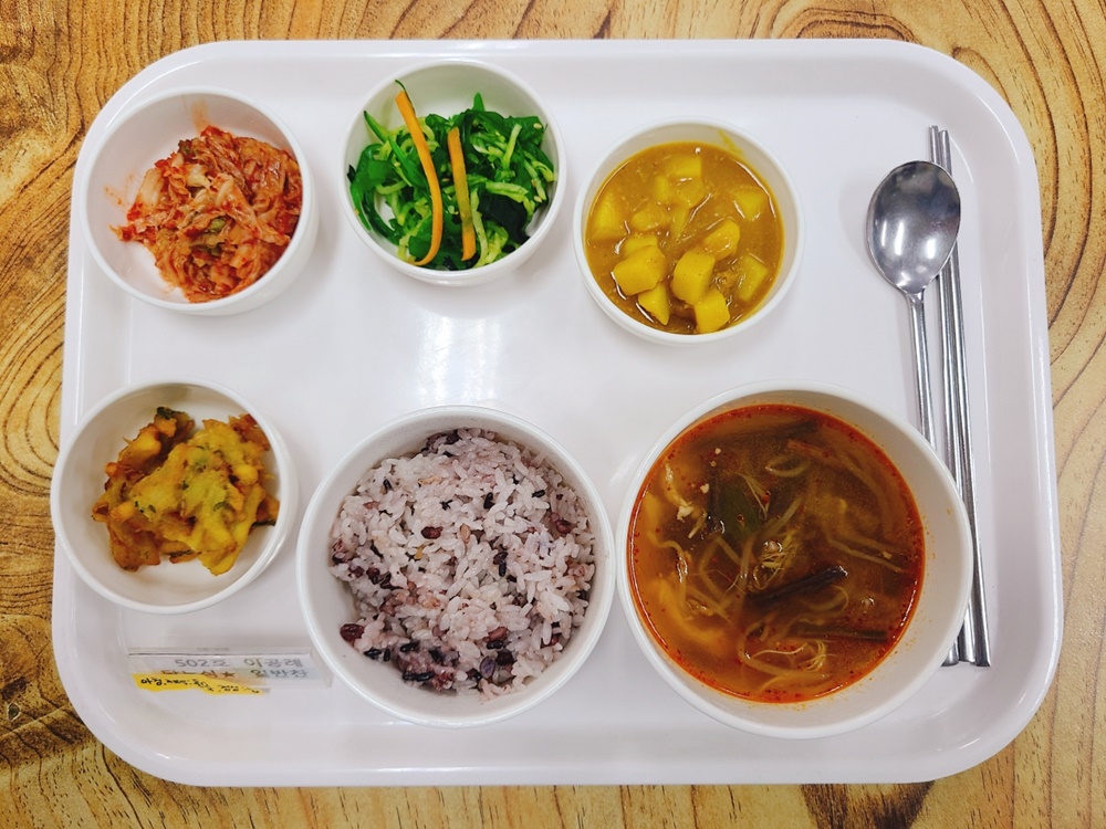 07월 20일 중식은 <백미밥(죽/잡곡밥) / 닭개장 / 카레소스 / 야채튀김 / 해초무침 / 김치 > 였습니다.