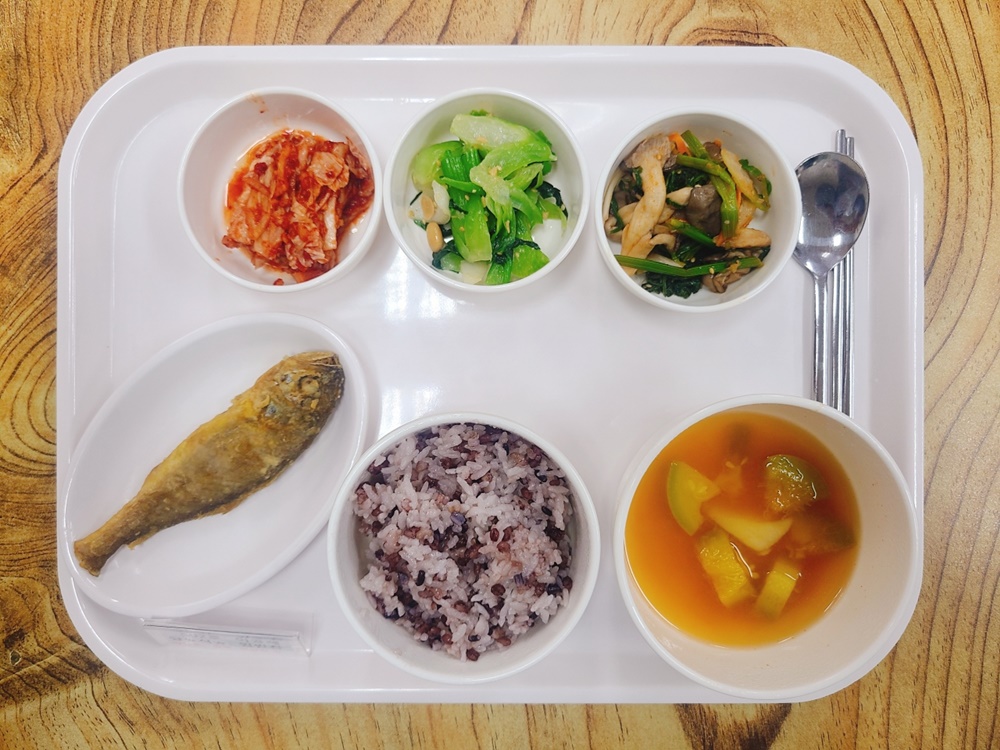 07월 27일 중식은 <백미밥(죽/잡곡밥) / 감자호박고추장찌개 / 조기구이 / 느타리미나리초무침 / 청경채된장무침 / 김치 > 였습니다.