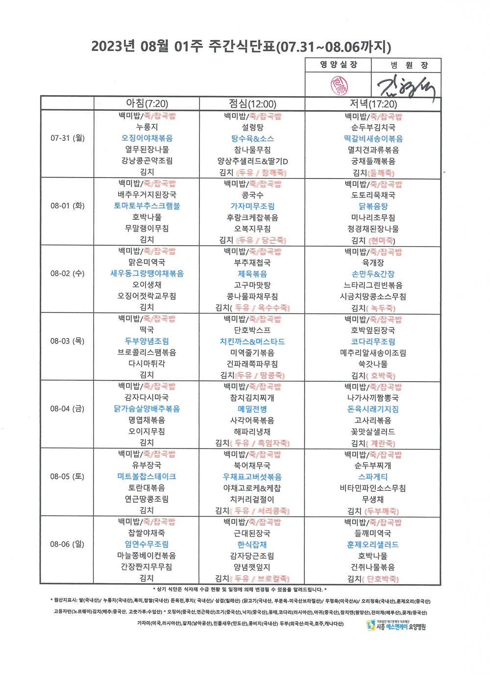 HOME > 병원소식 > 영양식단표