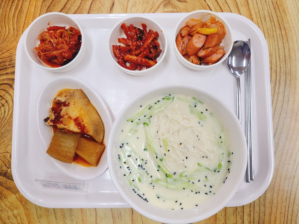 08월 01일 중식은 <백미밥(죽/잡곡밥) / 콩국수 / 가자미무조림 / 후랑크케찹볶음 / 오복지무침 / 김치 > 였습니다.