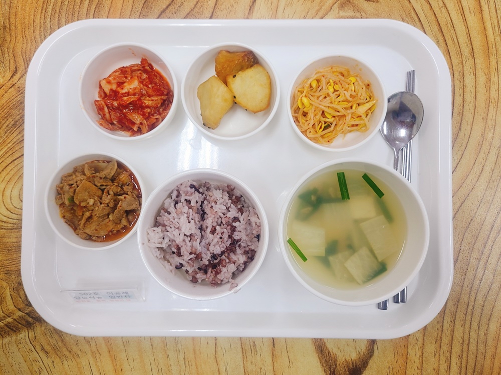 08월 02일 중식은 <백미밥(죽/잡곡밥) / 부추재첩국 / 제육볶음 / 고구마맛탕 / 콩나물파채무침 / 김치 > 였습니다.