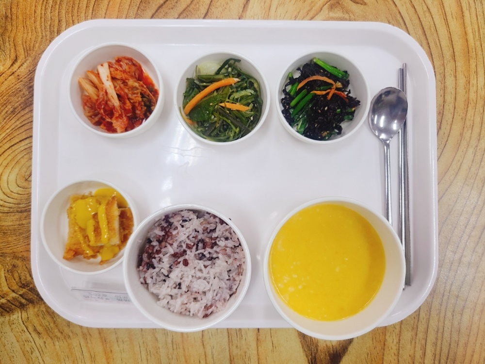 08월 03일 중식은 <백미밥(죽/잡곡밥) / 단호박스프 / 치킨까스&머스타드 / 미역줄기볶음 / 건파래쪽파무침 / 김치 > 였습니다.