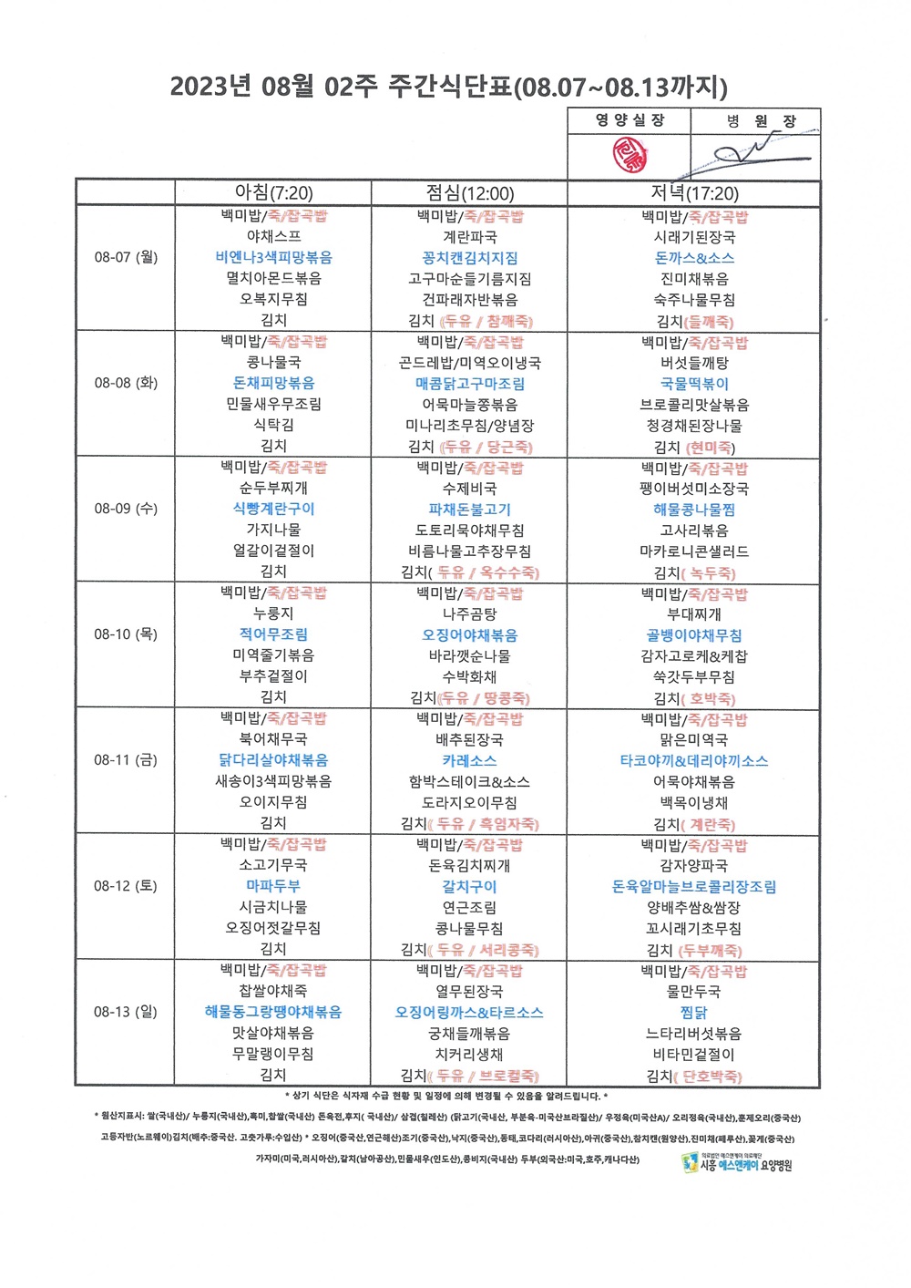 HOME > 병원소식 > 영양식단표