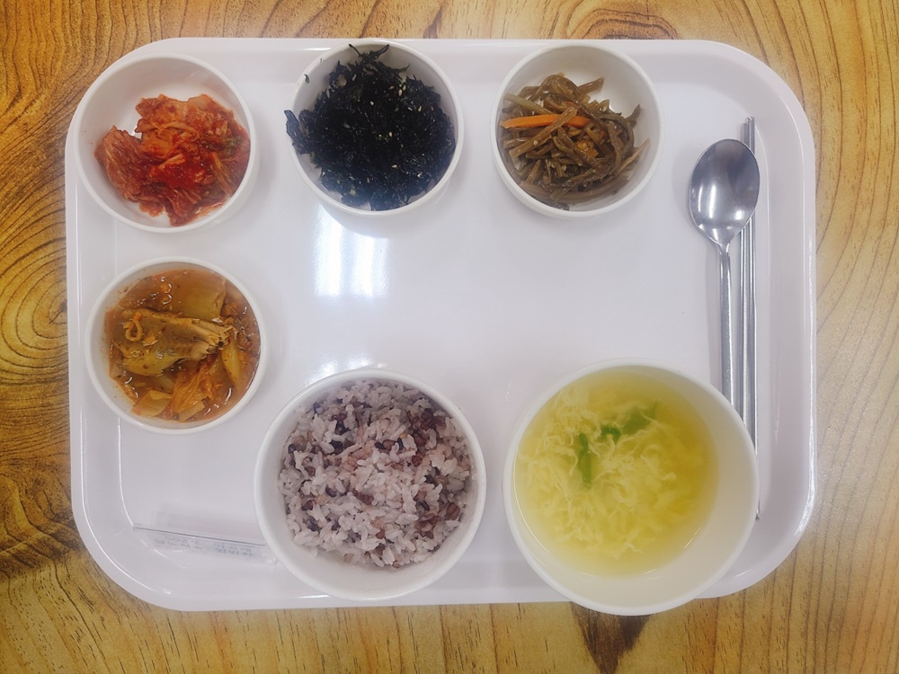 08월 07일 중식은 <백미밥(죽/잡곡밥) / 계란파국 / 꽁치캔김치지짐 / 고구마순들기름지짐 / 건파래자반볶음 / 김치 > 였습니다.