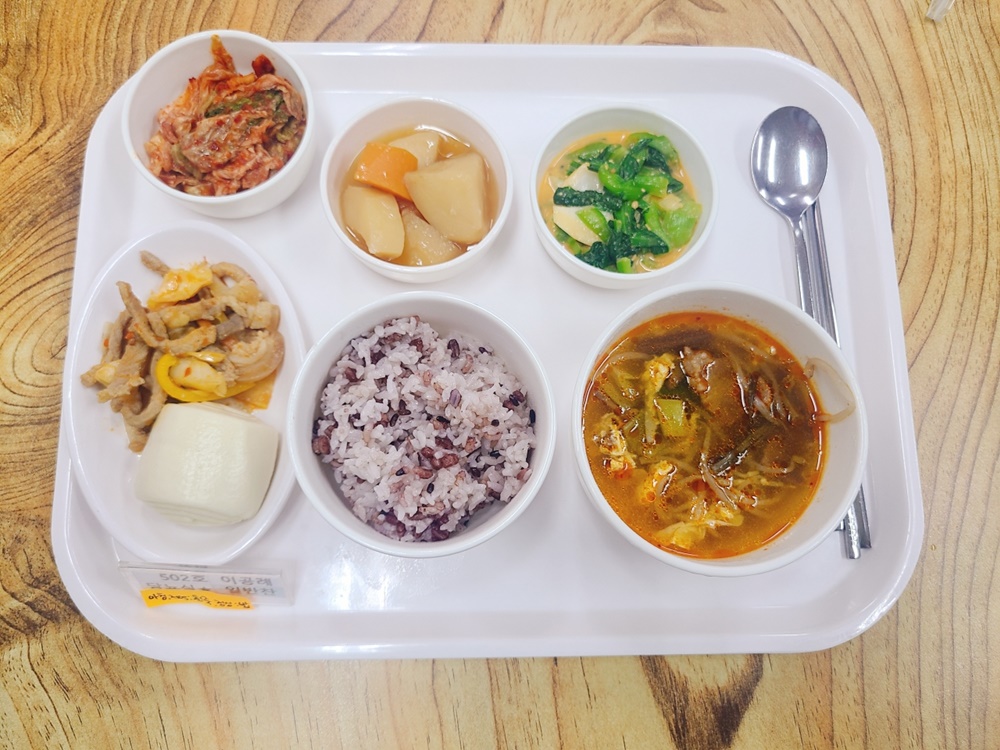07월 04일 중식은 <백미밥(죽/잡곡밥) / 육개장 / 피망잡채&꽃빵 / 감자당근조림 / 청경채쌈장나물 / 김치 > 였습니다.