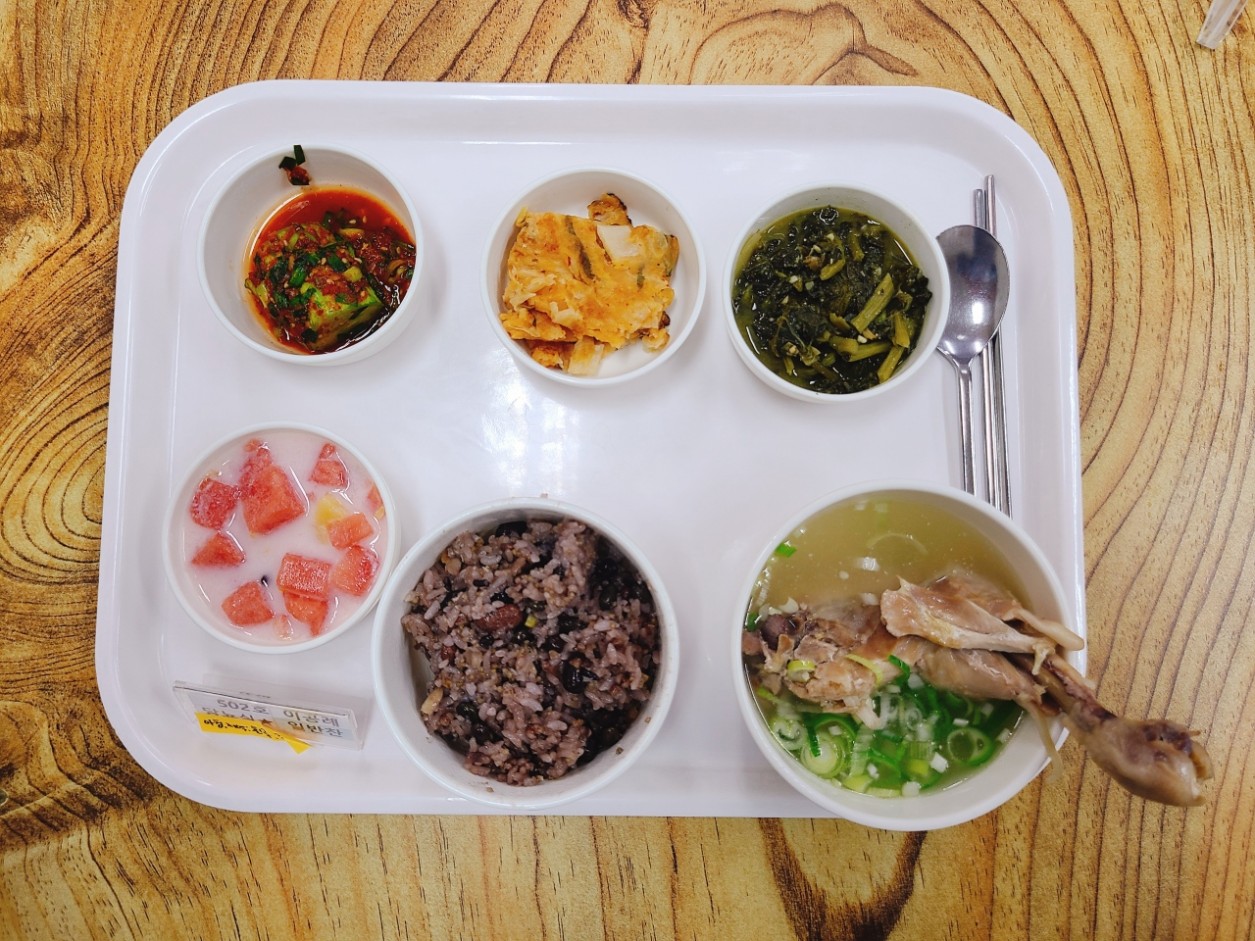 07월 11일 중식은 <영양밥(죽/잡곡밥) / 한방장각삼계탕 / 김치전 / 시래기멸치지짐 / 수박화채 / 오이소박이 > 였습니다.