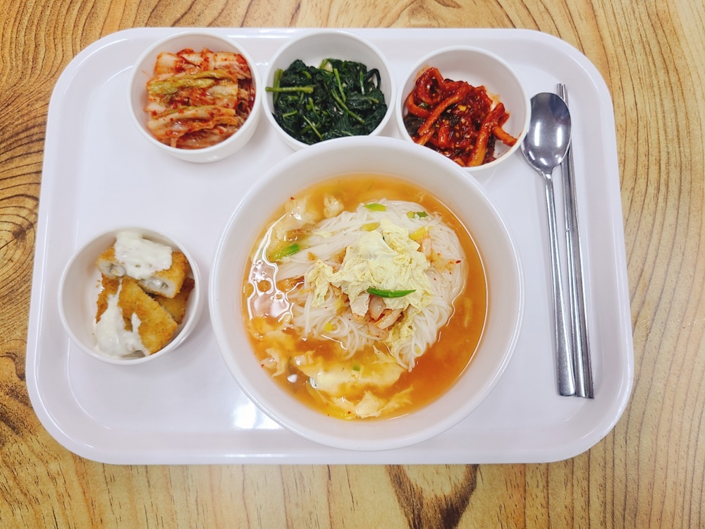 06월 21일 중식은 <백미밥(죽/잡곡밥) / 잔치국수 / 생선까스&타르소스 / 바라깻순나물 / 무말랭이무침 / 김치 > 였습니다.