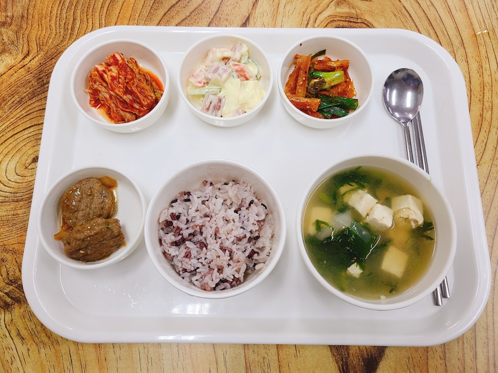 06월 26일 중식은 <백미밥(죽/잡곡밥) / 명란젓두부찌개 / 떡갈비3색피망볶음 / 북어채쪽파무침 / 멕시칸샐러드 / 김치 > 였습니다.